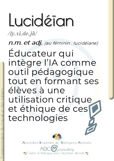 n.m. et adj. (au féminin : lucidéïane) Éducateur qui intègre l’intelligence artificielle comme outil pédagogique tout en formant ses élèves à une utilisation critique et éthique de ces technologies, développant leur lucidité face aux défis numériques. S’emploie également comme adjectif pour qualifier un enseignant qui adopte cette approche.
