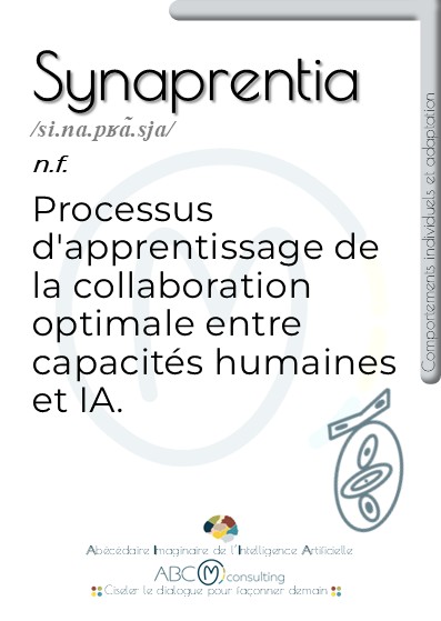 Fusion élégante de « syn » (ensemble), « apprendre » et « IA« , ce terme désigne le cheminement nécessaire pour atteindre un véritable syngacis (complémentarité cognitive entre humain et IA). Contrairement à la simple utilisation passive d’outils, la synaprentia implique une démarche active d’adaptation et d’expérimentation pour identifier les complémentarités optimales.