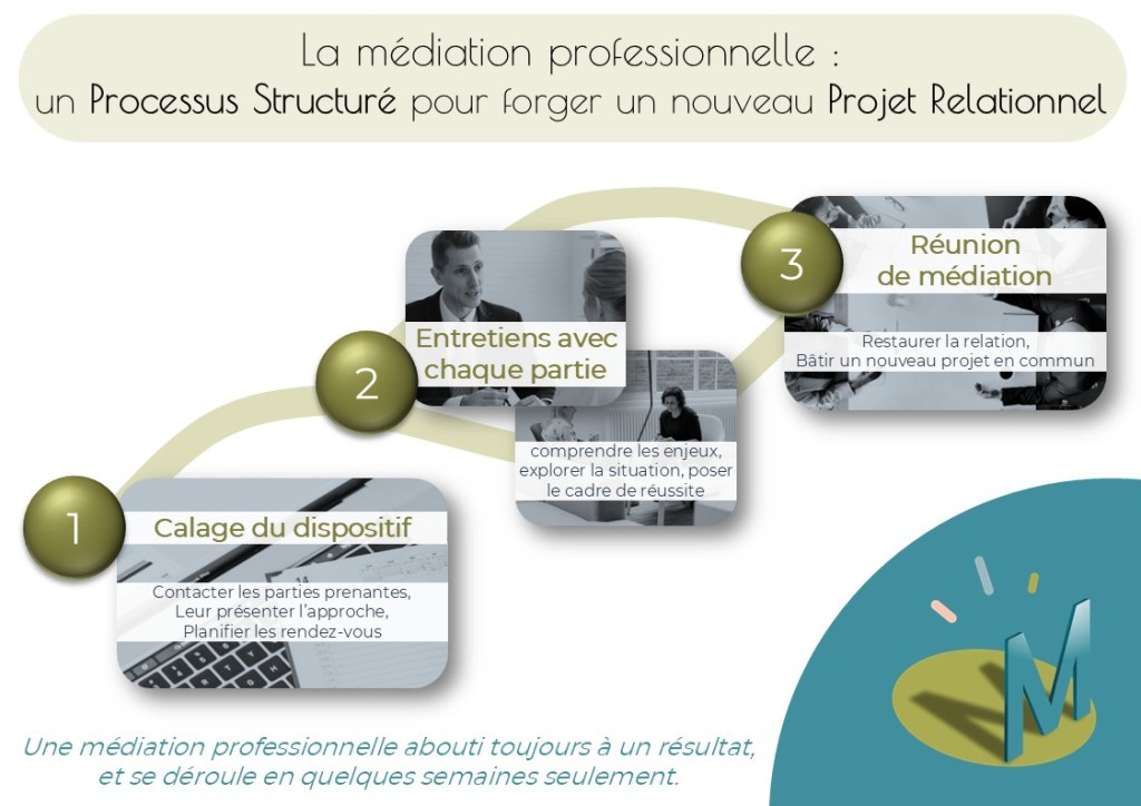 En aucune manière le médiateur professionnel ne se prononcera sur quelque solution possible au conflit. Tout au contraire, il aide les parties à trouver une solution dont chacune est satisfaite. Son intervention s’inscrit au long terme, dans le sens où elle permet d’établir une qualité relationnelle renouvelée.